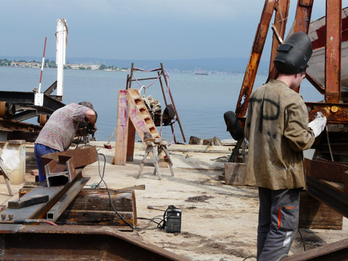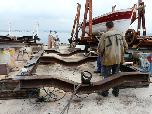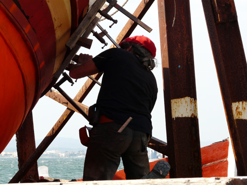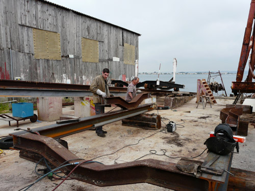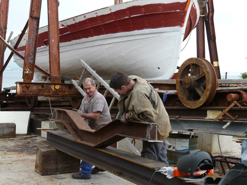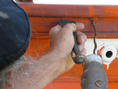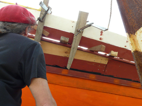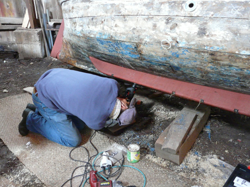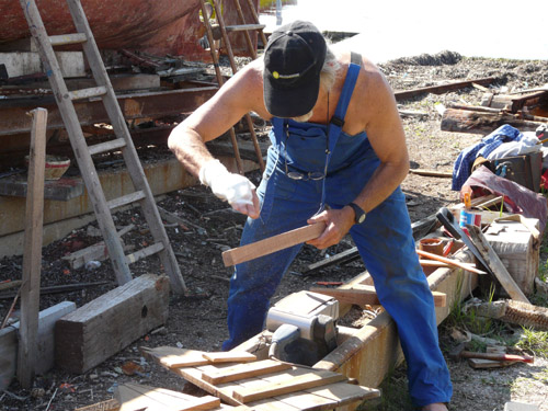 Ici c’est Thibault notre stagiaire préparant un CAP de charpente maritime : il travaille actuellement sur Damienne avec notre ami Jouss (de passage) : que de jambettes à changer !!!