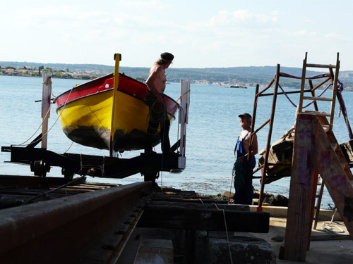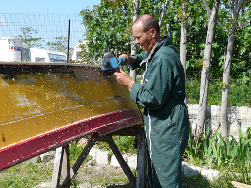 Philippe répare son canoé, qui navigue à la voile latine ! eh oui !