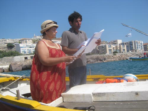 Nous embarquons cette fois sur la Damienne une poétesse turque Müesser Yeniay et un poète occitan Michel Destieu et c’est 1h et demie de poésie « lecture intimiste en mer « ; et l’Hébé est à couple et Gérard est aux anges !