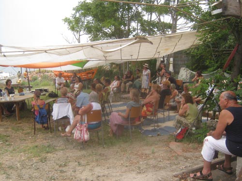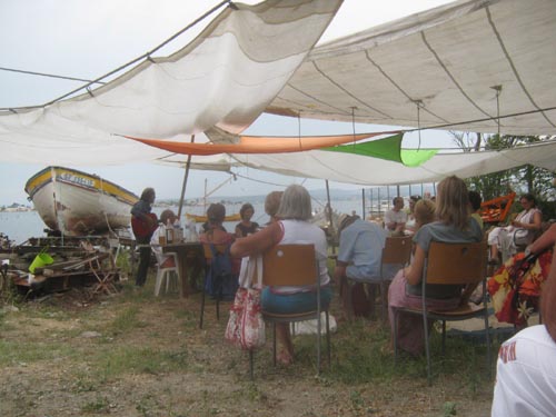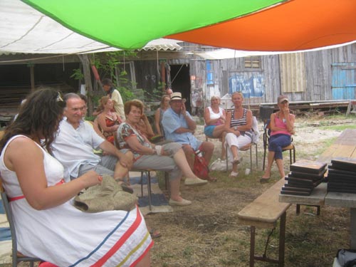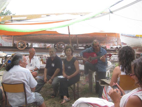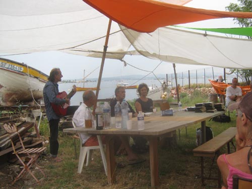 L’après midi, un arrêt est prévu au Chantier des Voiles Latines à la Plagette : beau décor sur l’étang de Thau, les voiles tendues pour le public, les barques à restaurer sur les « bers »et les barquettes au mouillage sur l’eau. Nous y avons reçu Carlo Bordoni d’Italie, Alain Andreucci de France, et Salvador Paterna à la guitare… le public est conquis…