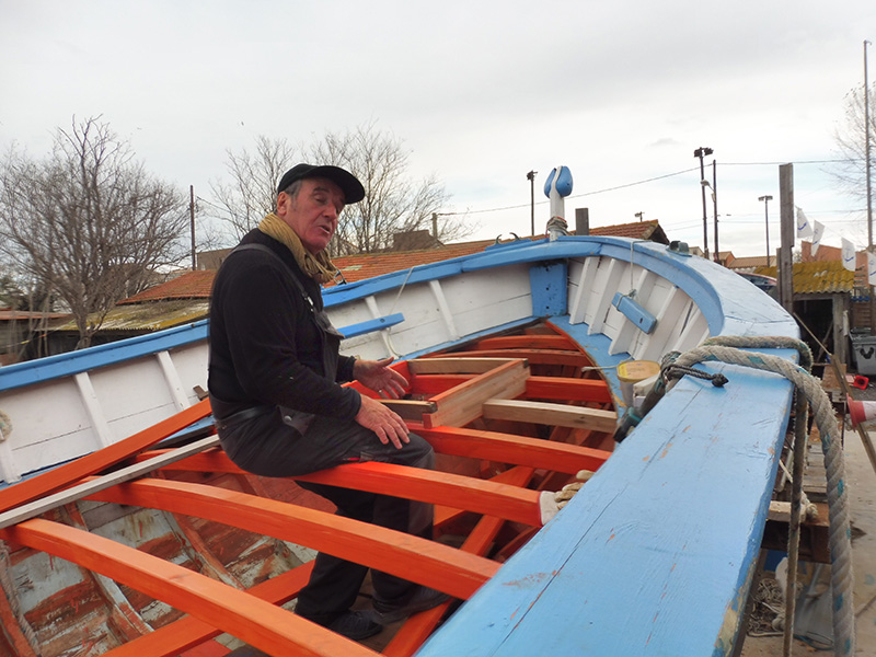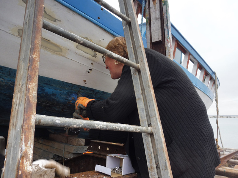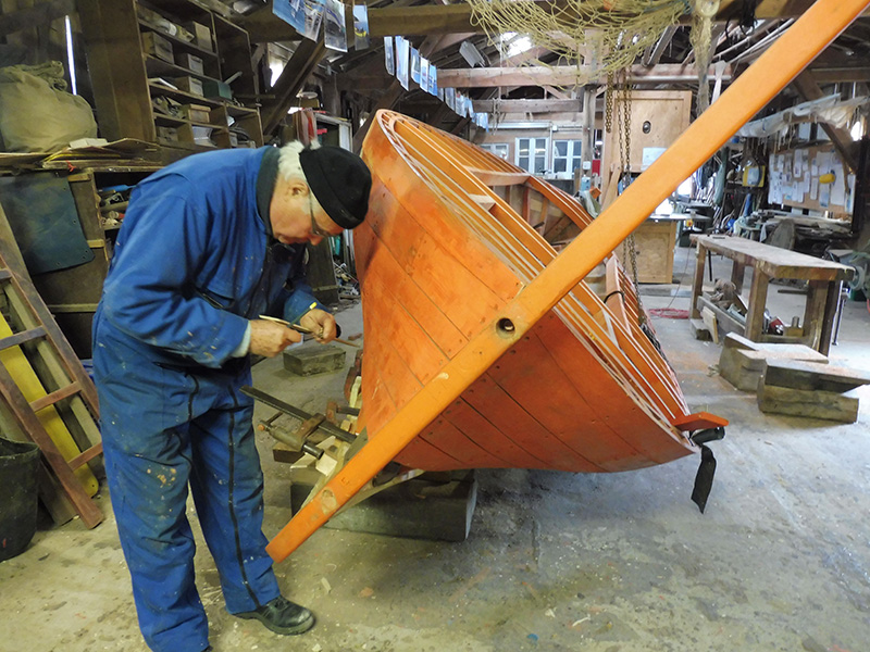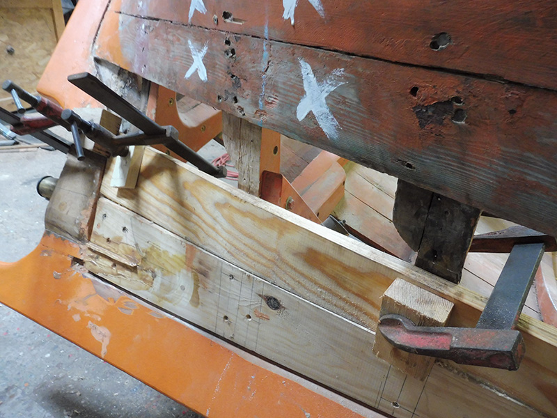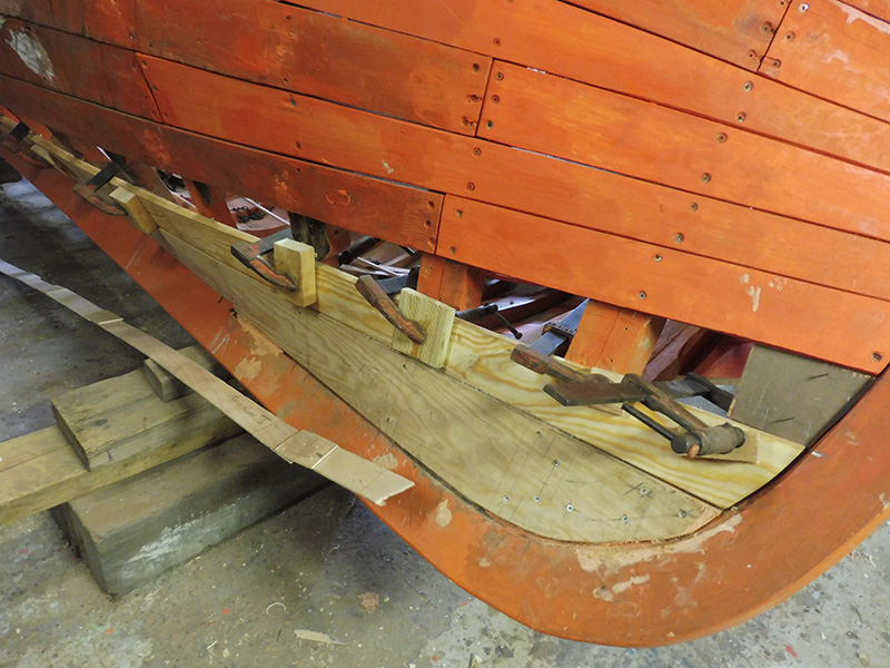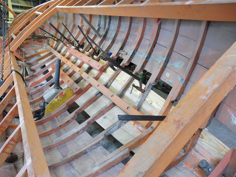 À l’intérieur, notre charpentier change les galbords et ribords, 1ers bordés après la quille car les planches sont loin d’être plates et elles doivent vriller (!?), d’où les serre-joints…