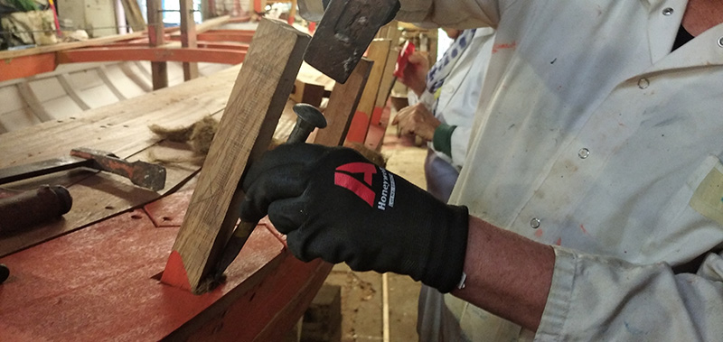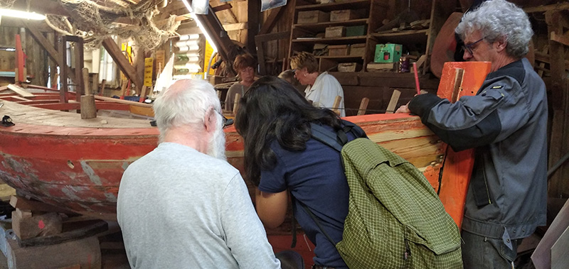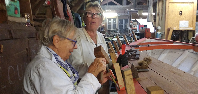 Une bonne équipe : Anne, de dos, vérifie le calfatage, Gilles à l’étrave met sa signature.
