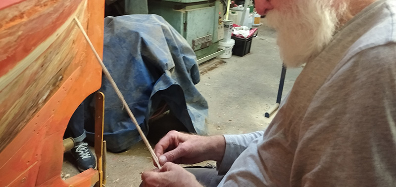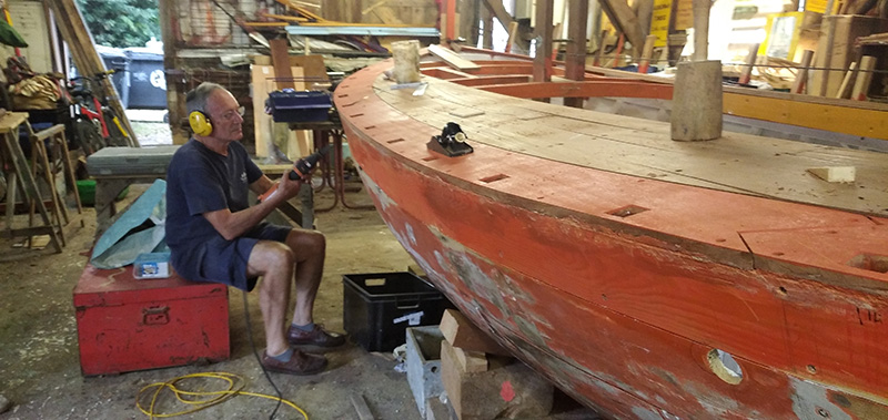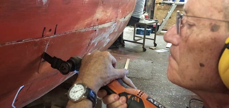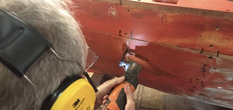 Le pont avance, les trous ronds attendent les tampons, et les trous carrés attendent les jambettes. Bernard, lui, se concentre sur un bordé mal en point, il manie avec maestria la Fein, et y ajoute un effet d’ombre et lumière.