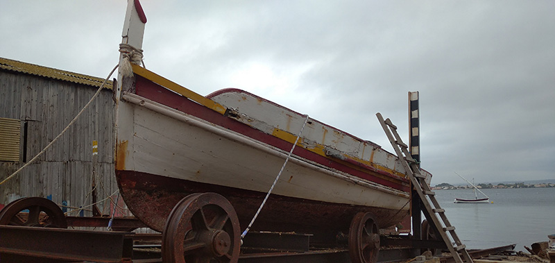 Dehors, une catalane de Bouzigues avec son capian en sabot, qui a bien vécu, attend, impassible, sa couche d’antifouling.