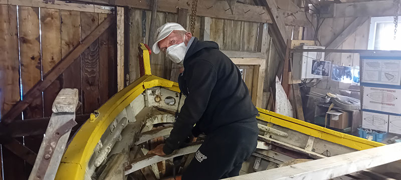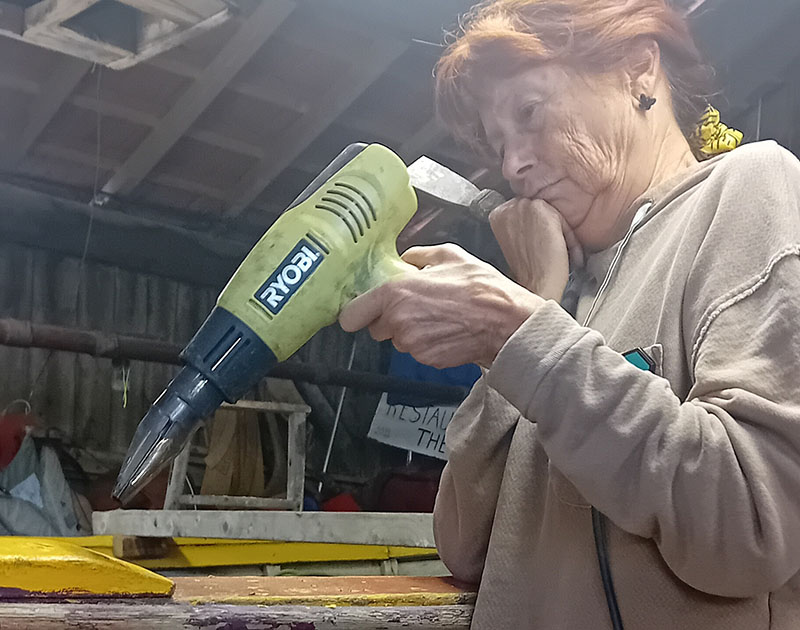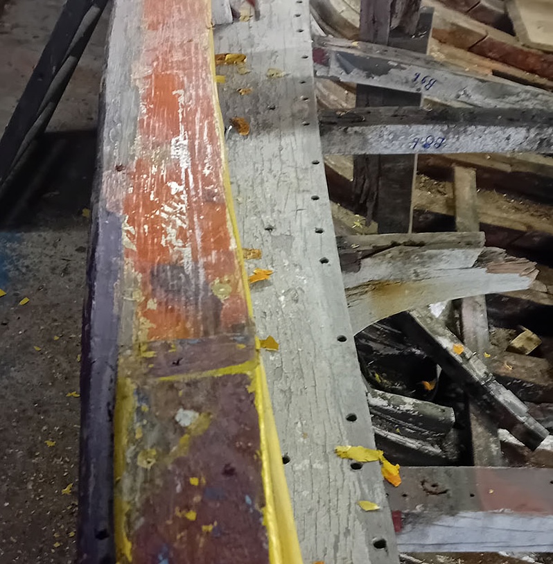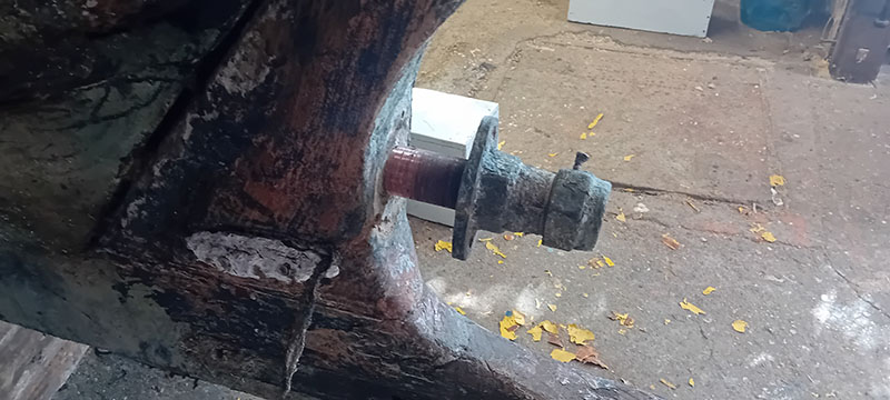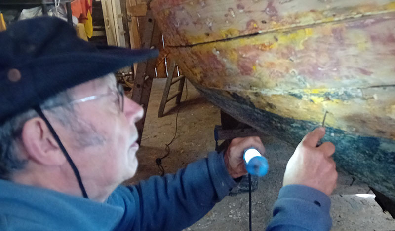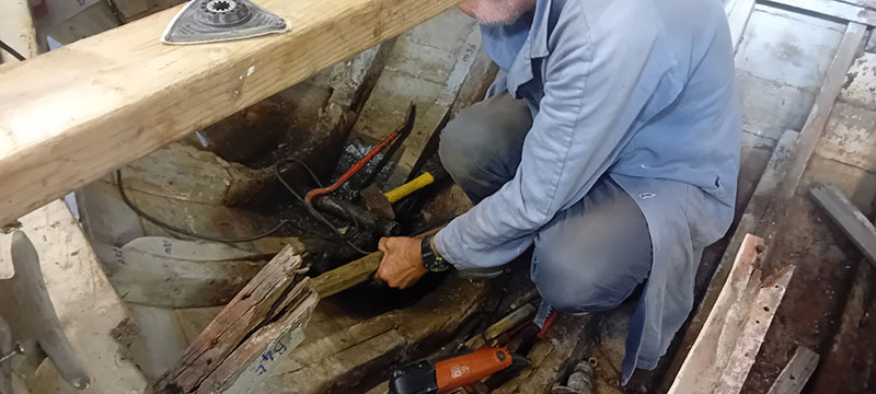 on cherche l’emplacement des anciens clous, on décape la vieille peinture pour voir l’état du bois, on retire le brai( goudron) pour laisser passer l’axe…