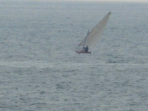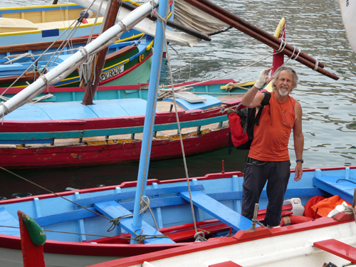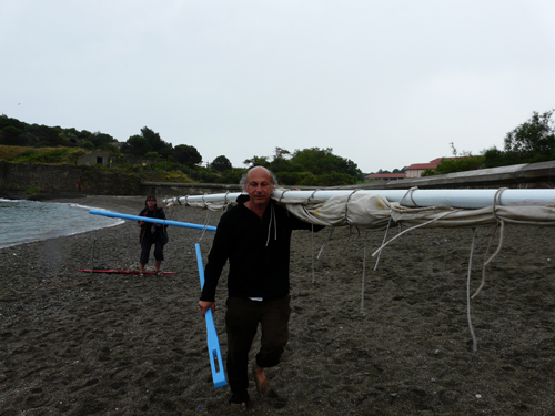Philippe répare son canoé, qui navigue à la voile latine ! eh oui !