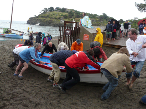 Et maintenant, il faut tirer l’Andrea sur le sable pour le retour : heureusement la solidarité est là ! Merci à tous !