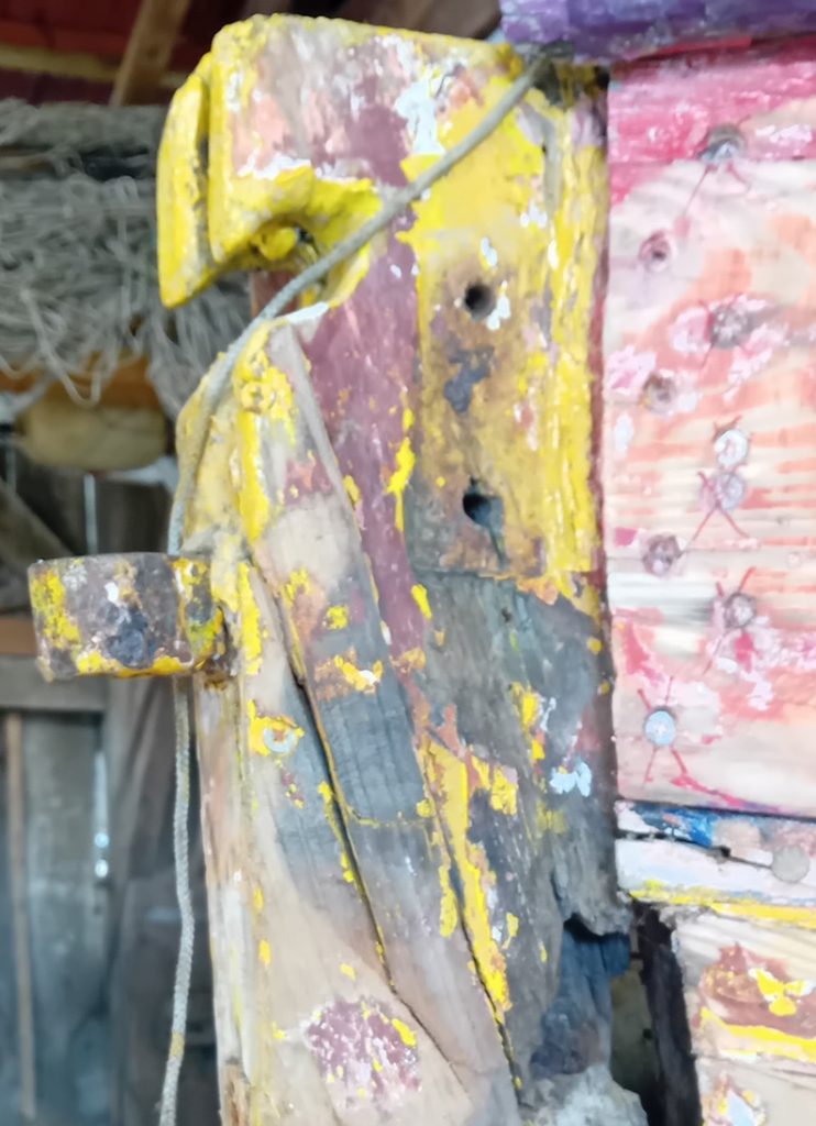 on cherche l’emplacement des anciens clous, on décape la vieille peinture pour voir l’état du bois, on retire le brai( goudron) pour laisser passer l’axe…